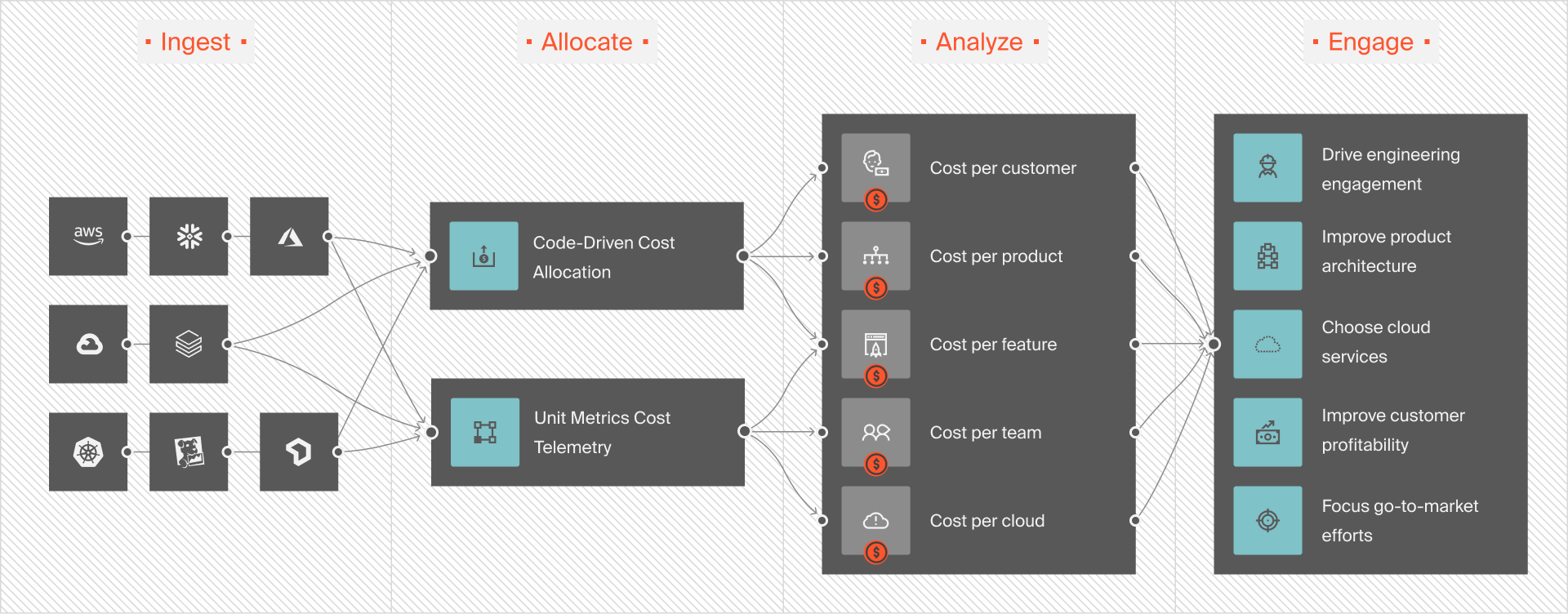 CloudZero’s Cloud Cost Intelligence approach enables organizations to connect cloud costs to specific business indicators, such as the cost per customer, feature, and development project. Engineers and finance can use this breakdown to understand how their activities impact the company and to find ways to optimize spending.