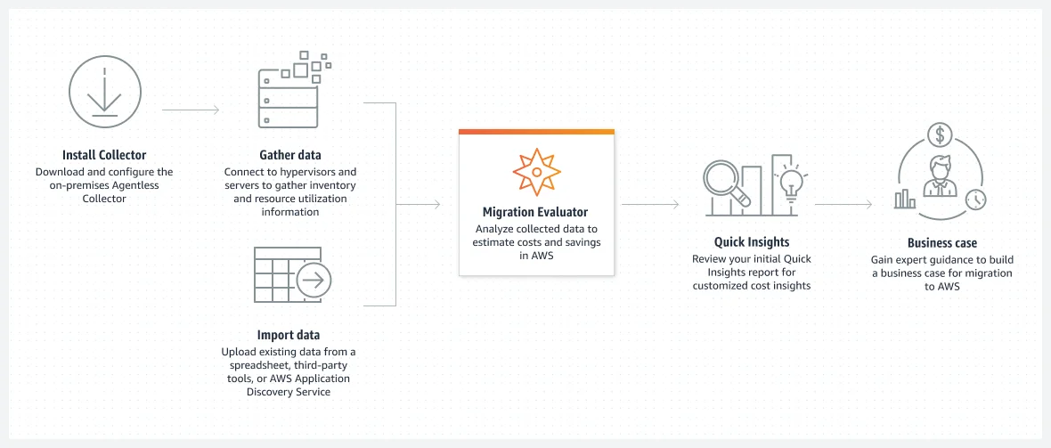 Formerly TSO Logic, Migration Evaluator is another AWS tool that helps businesses create a clear plan for cloud migration. It analyzes on-premises infrastructure and generates cloud migration scenarios, focusing on cost savings. The tool assesses current server configurations, resource use, and software licenses, providing options that align with your budget and needs.