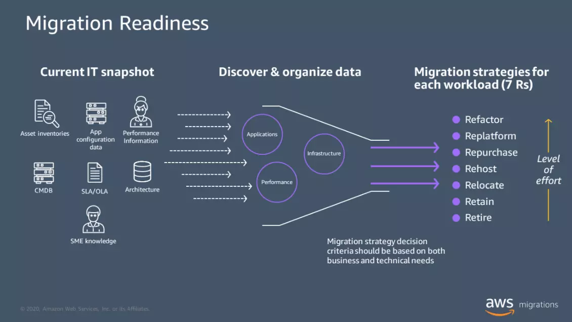 Also included are the costs specific to your chosen AWS cloud migration strategy. Consider this. A lift and shift approach may limit how many cloud-native capabilities you can utilize. But it is a faster and less costly strategy than refactoring, which involves re-architecting your application to take full advantage of cloud-native technologies that the AWS infrastructure supports.